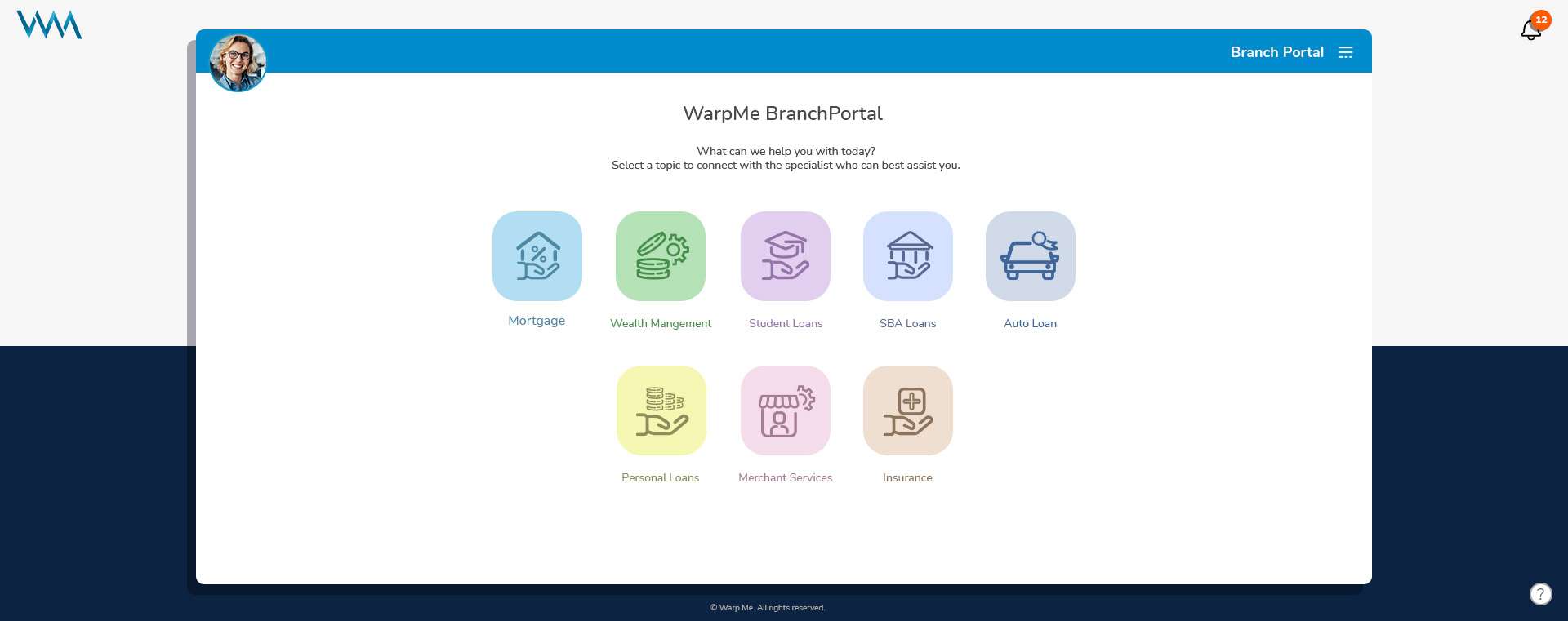 The WarpMe solution also provides a complete in-branch experience for customers who prefer to come into a physical location for their banking needs. With WarpMe BranchPortal, customers can intuitively interact with a touchscreen to digitally connect with the right specialists to fit their needs.